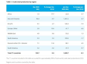 انجمن جهانی فولاد در گزارشی آخرین وضعیت تولید فولاد جهان در ماه دسامبر ۲۰۲۳ را منتشر کرد. بر اساس این گزارش میزان تولید جهانی فولاد خام برای ۷۱ کشور گزارش شده به انجمن جهانی فولاد (worldsteel) در دسامبر ۲۰۲۳، ۱۳۵.۷ میلیون تن (Mt) بود که ۵.۳ درصد نسبت به دسامبر ۲۰۲۲ افزایش داشت.